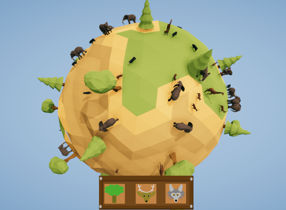 The idea behind this game is to create and maintain a ecosystem. The reason that I quit this project is because I could not figure out how to make the gameplay fun. This prototype was a good learning experience because it was difficult to get the spherical movement working correctly.